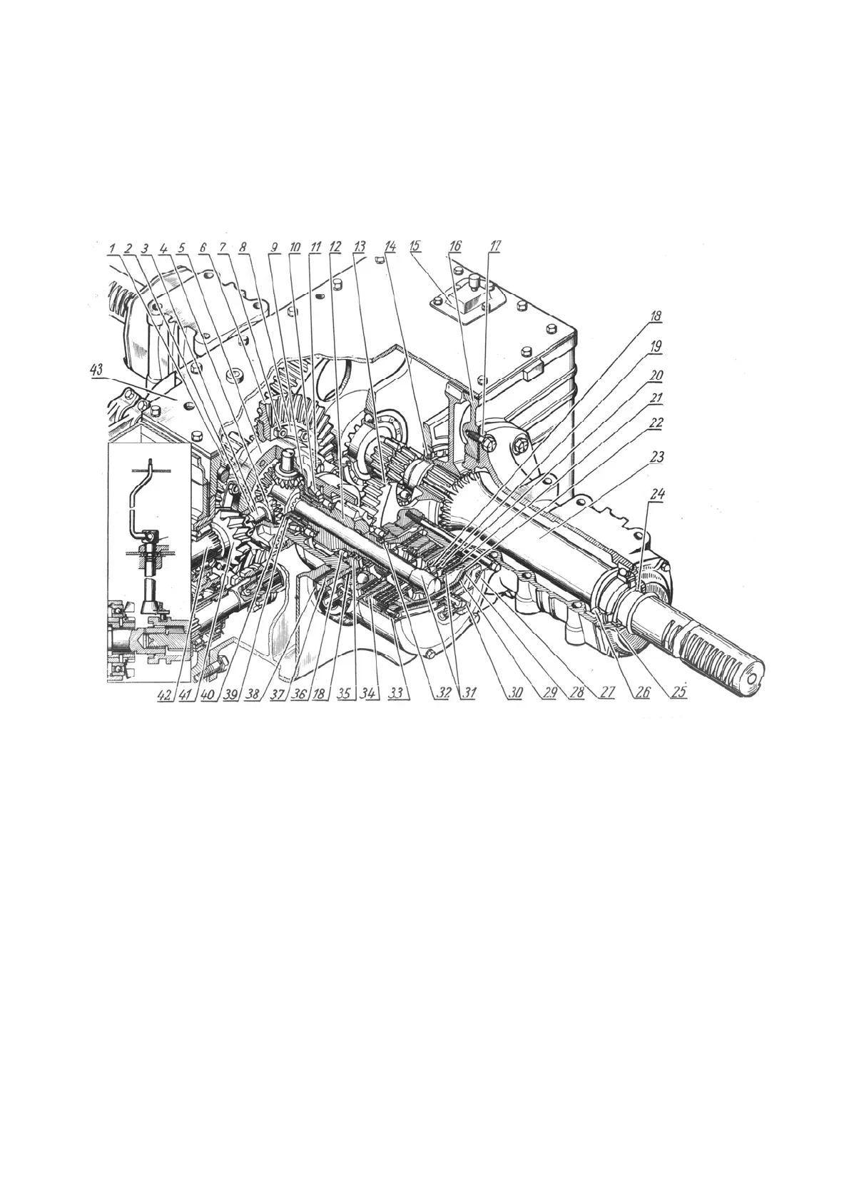 gear of the main drive; 42 - secondary shaft of the gearbox; 43 - rear axle cover.
