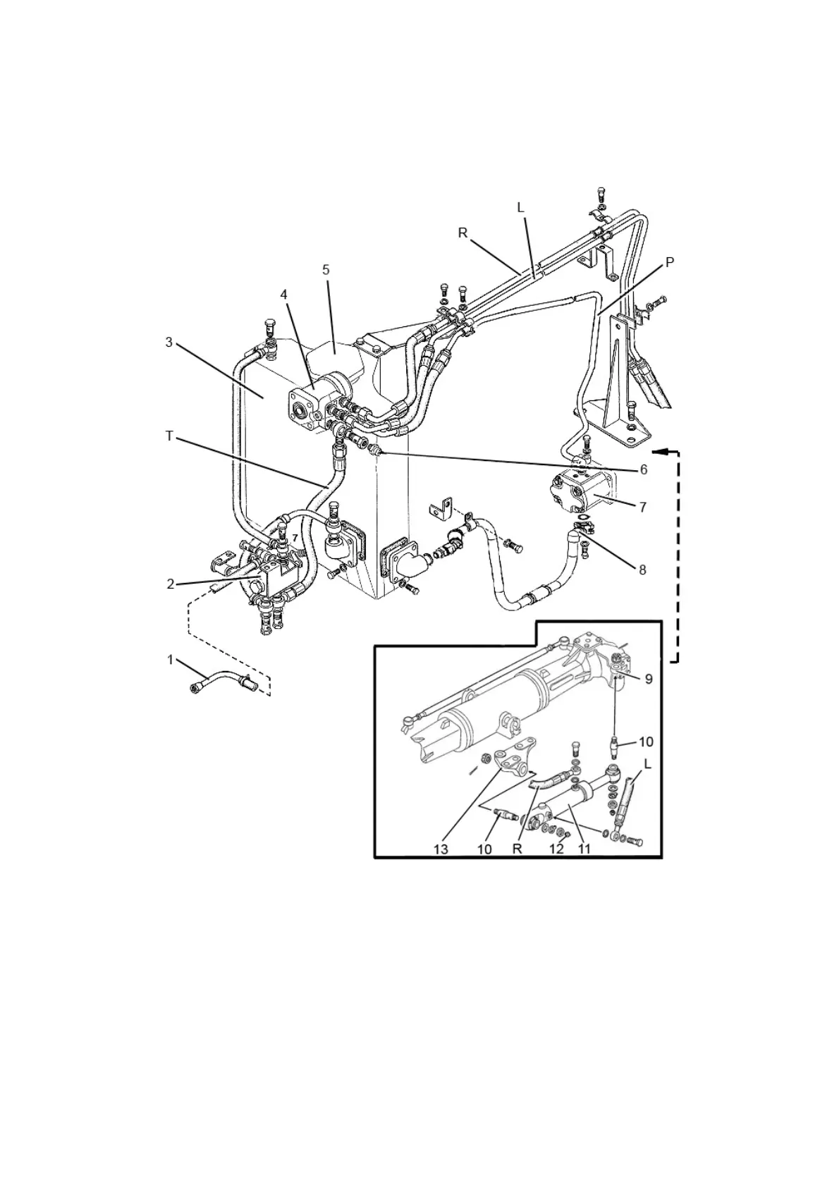 cylinder of turning; 12 - grease fittings; 13 - cylinder bracket; P - pressure hydraulic line; T -