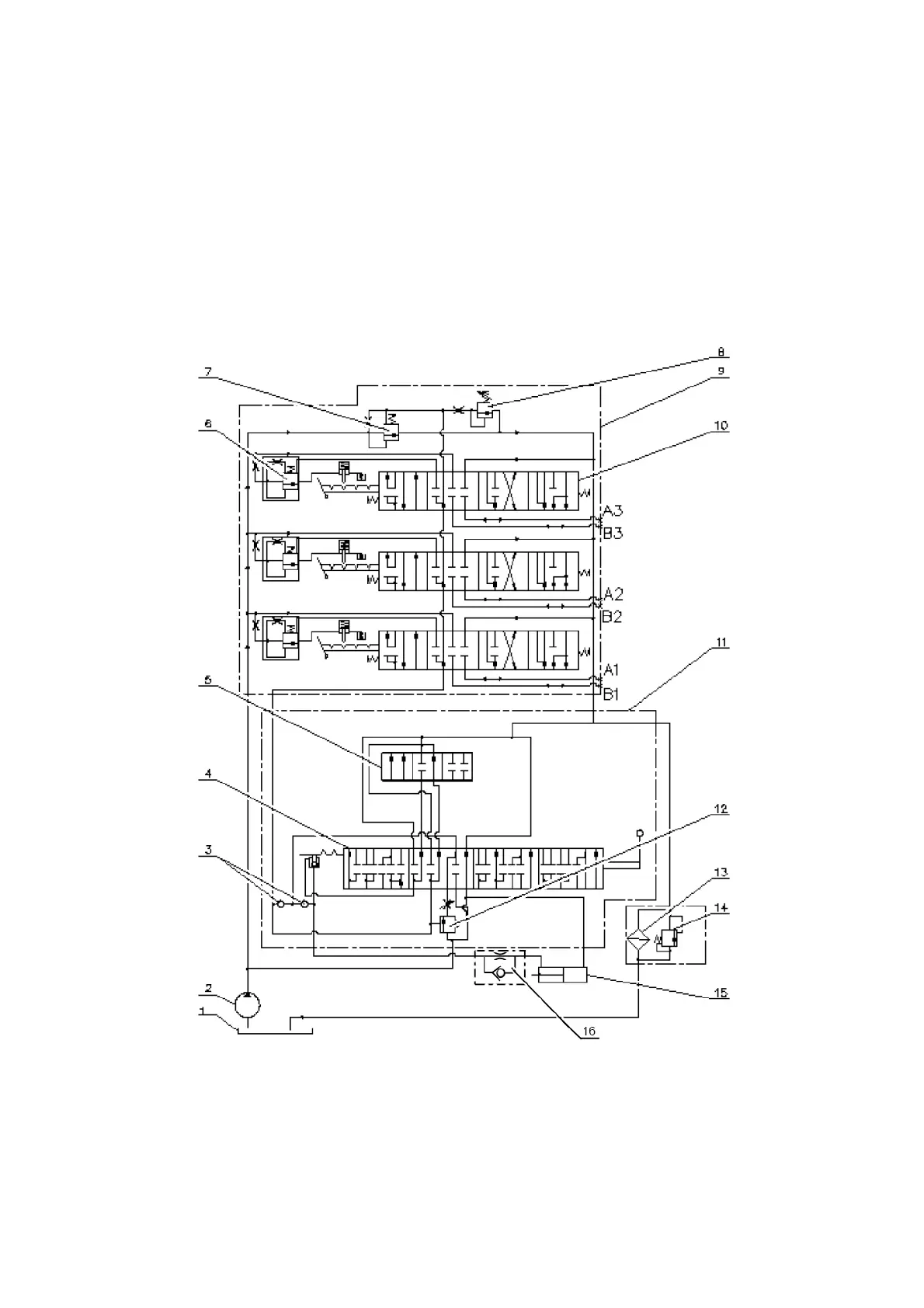 control unit; 12 - priority valve; 13 - hydraulic system filter; 14 - filter valve; 15 - cylinder; 16 -