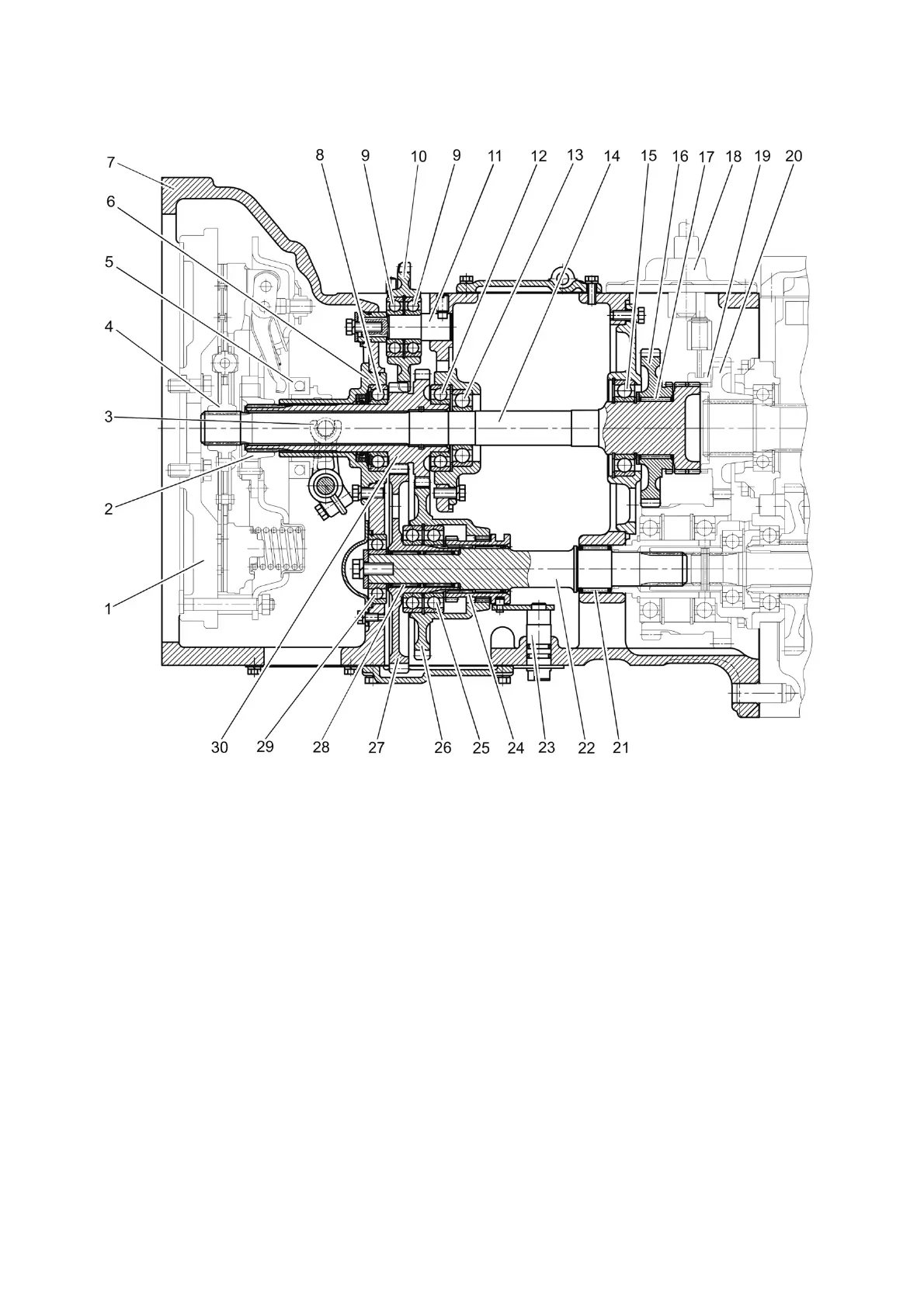 bracket; 7 - clutch housing; 8, 9, 12, 13, 15, 25, 29 - bearing; 10 – HLL pump drive gear; 11 -
