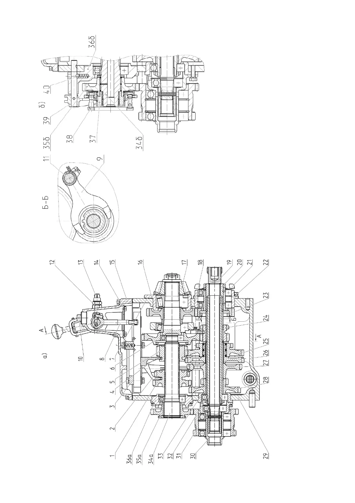 gear unit; 36a and 36b - cage; 37 - bushing; 38 - synchronizer; 39 - shaft with yoke; 40 - retainer ball.