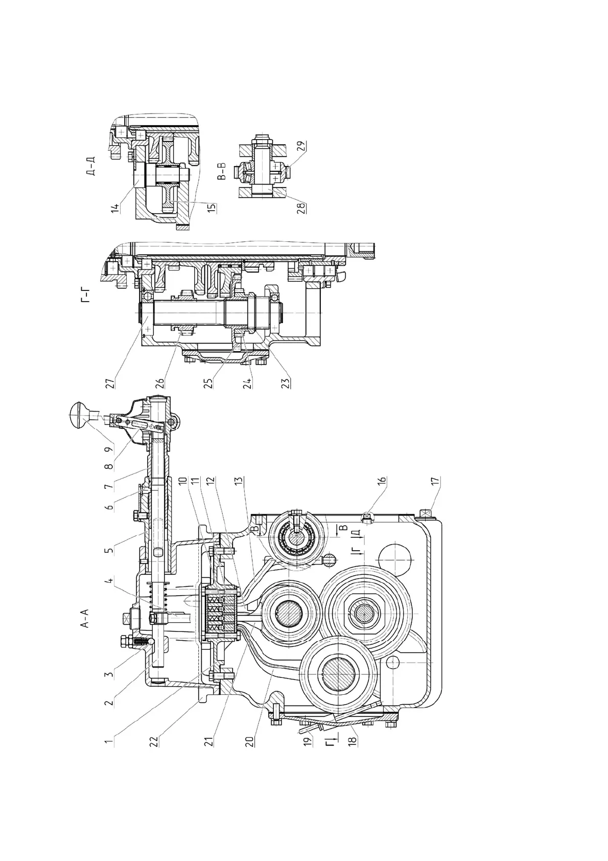1st speed and reverse; 28 - axle of FDA drive gear; 29 - FDA drive gear