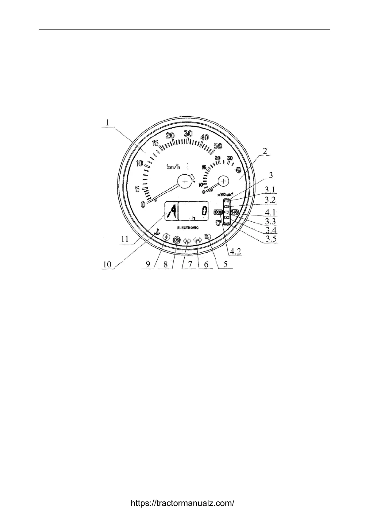a) 1 (Fig. 5) – speedometer – displays design tractor speed on needle indicator. Design