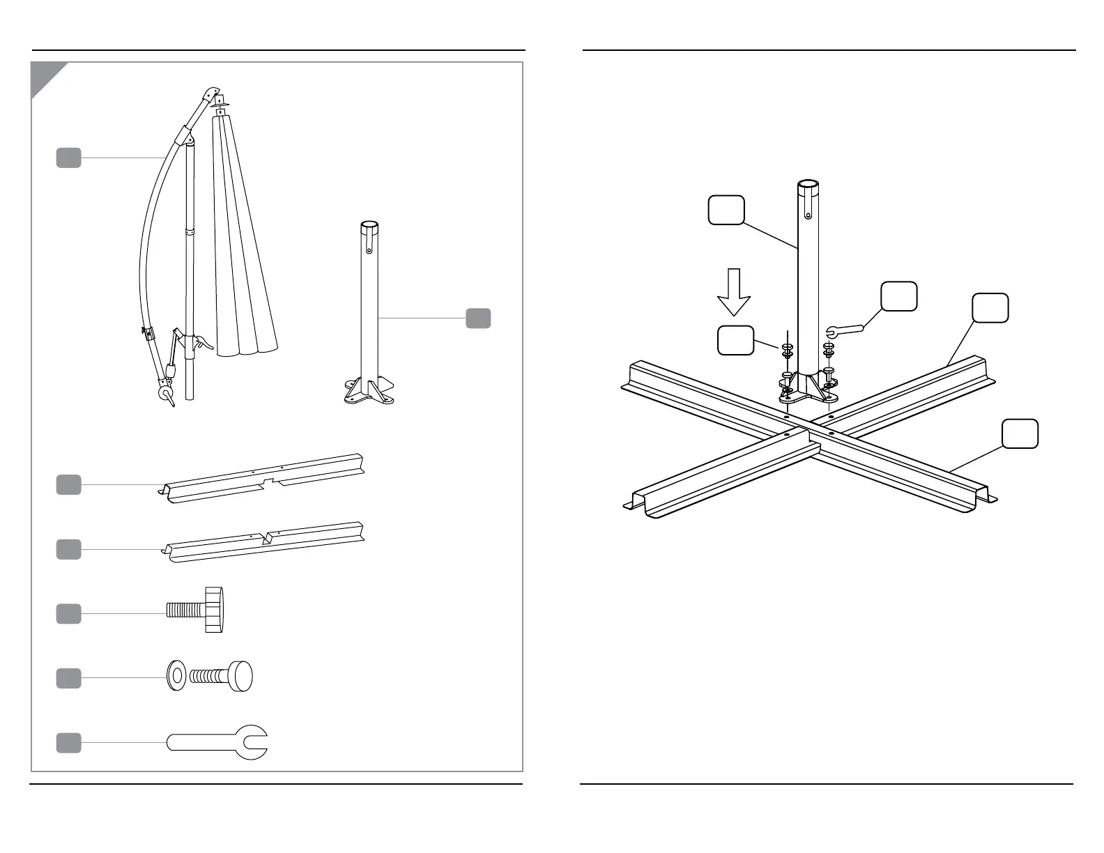 Attach the Bottom Pole (B) to the cross bars using the four Bolts (F) with