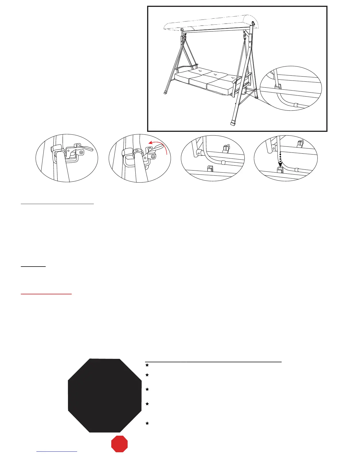 5. Always remove the canopy in heavy wind conditions. Otherwise, the swing may tip over and cause damage to