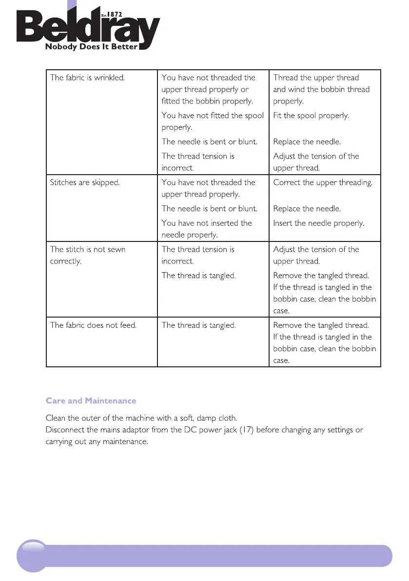 The fabric does not feed. The thread is tangled. Remove the tangled thread.