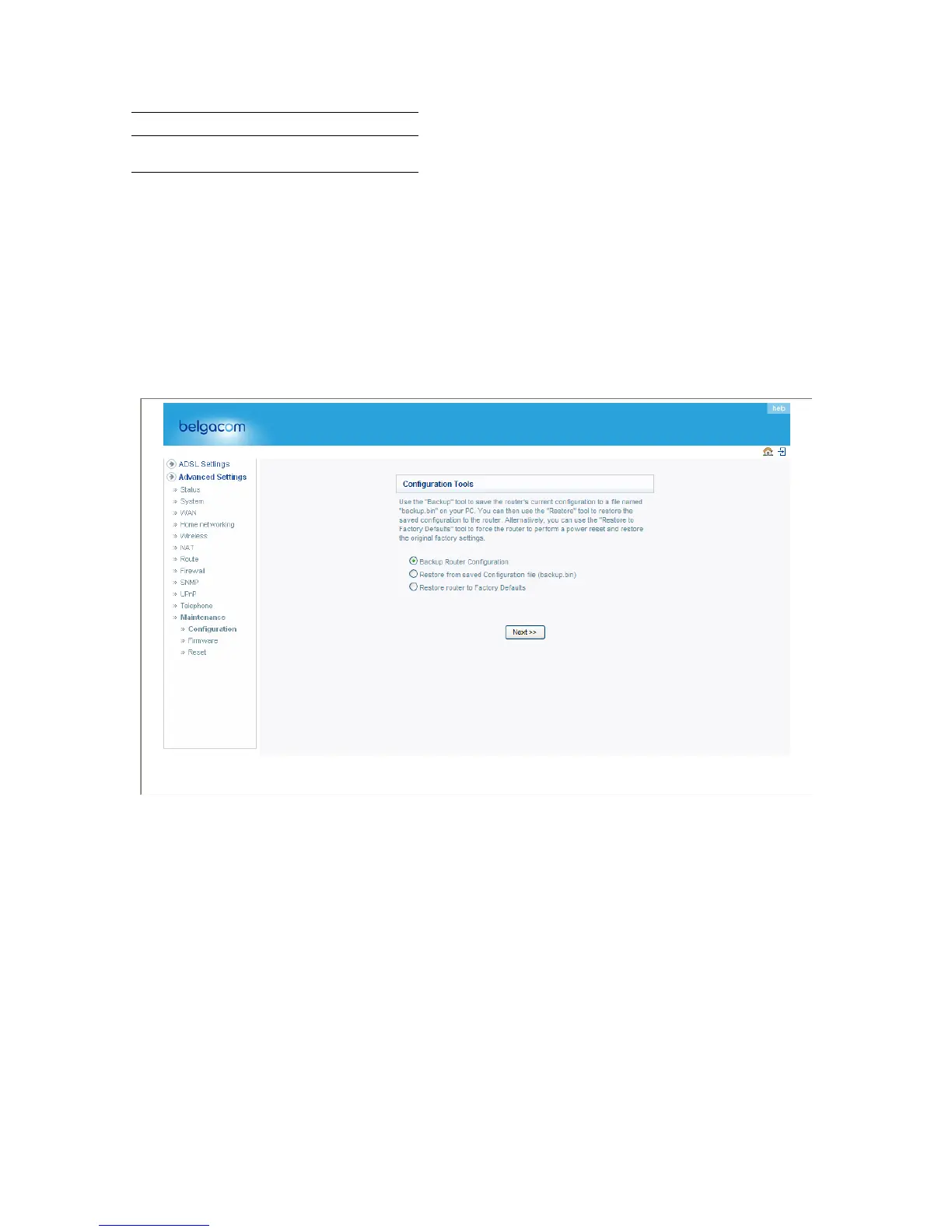 Check Backup Router Configuration and click “NEXT” to save your Belgacom b-box’s