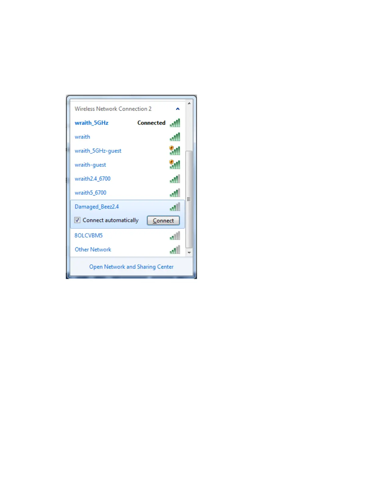 În exemplul de mai jos, computerul era conectat la o altă rețea wireless numită wraith_5GHz. Numele