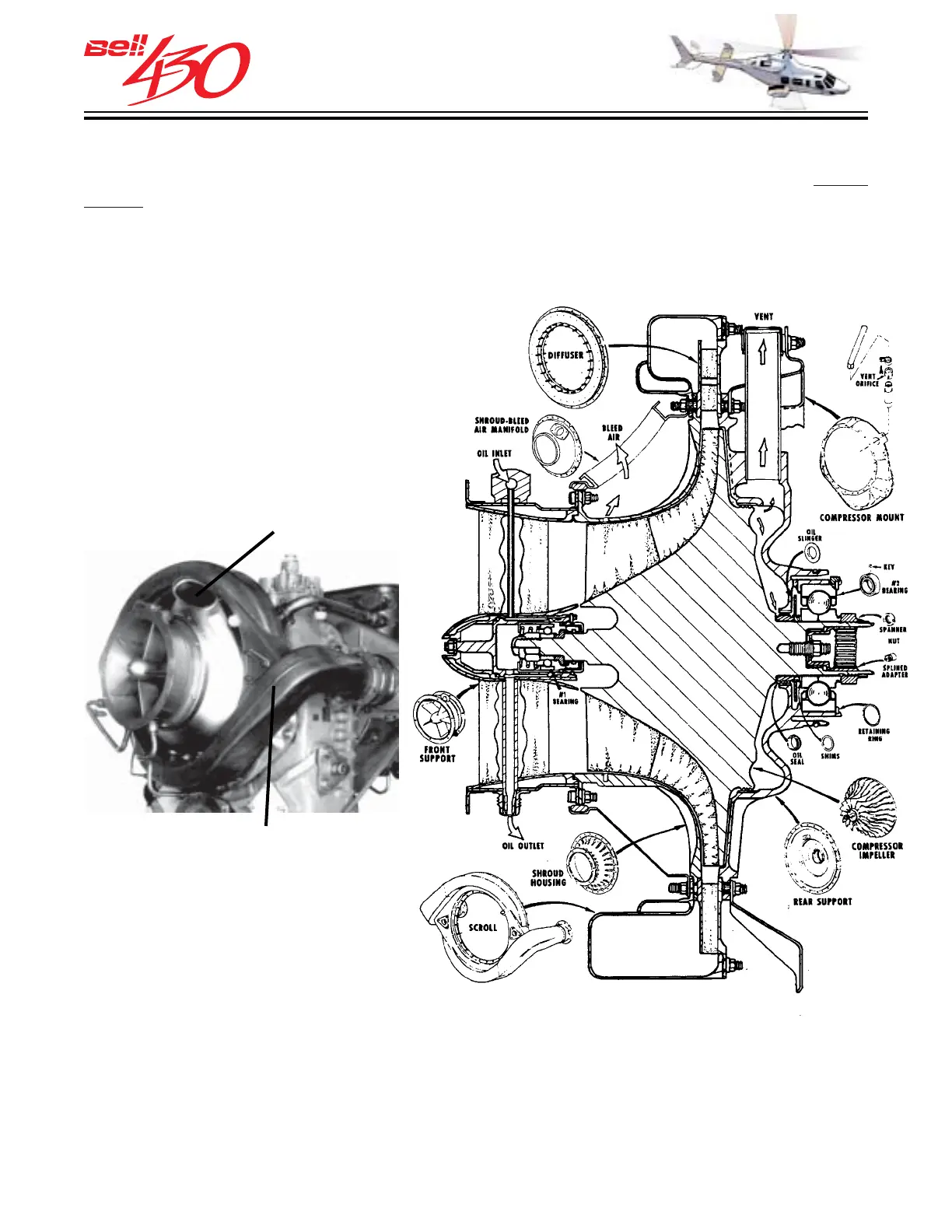 at takeoff power ) and discharges it through a diffuser assembly and dual scroll collector
