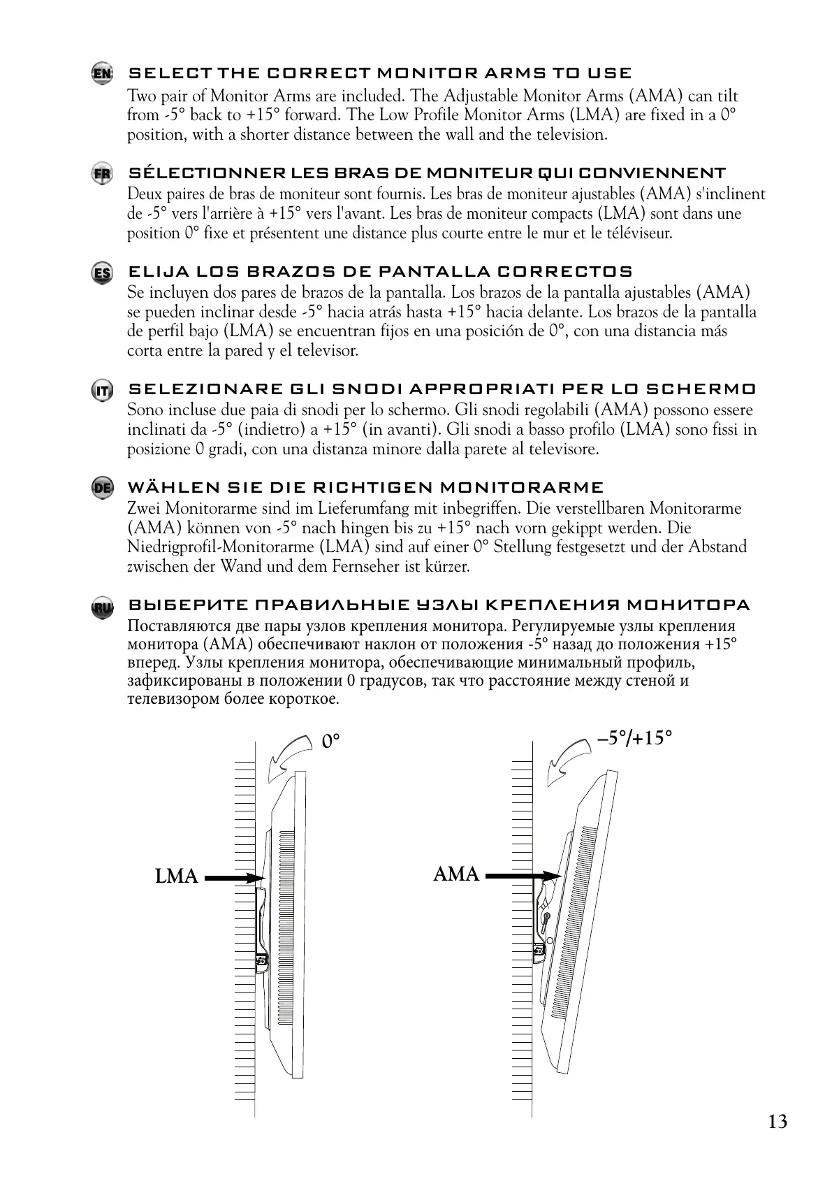 from -5° back to +15° forward. The Low Profile Monitor Arms (LMA) are fixed in a 0°