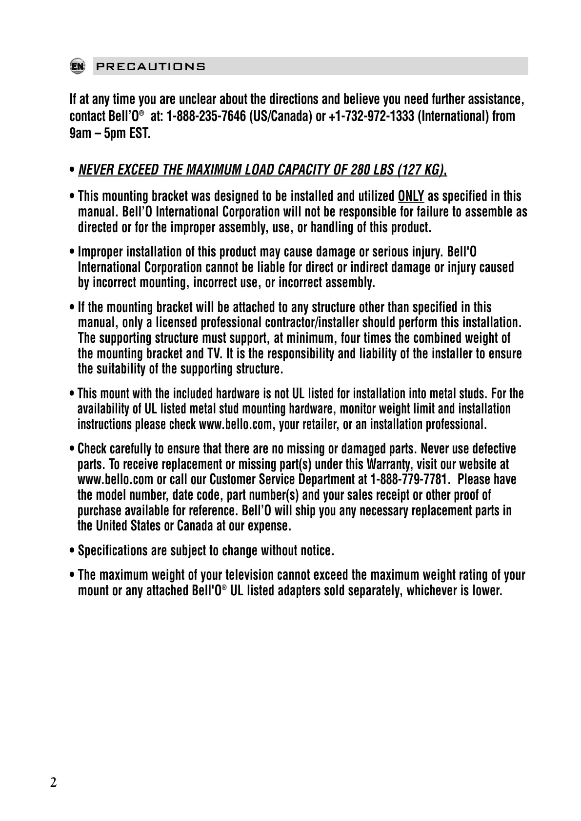 • Improper installation of this product may cause damage or serious injury. Bell'O