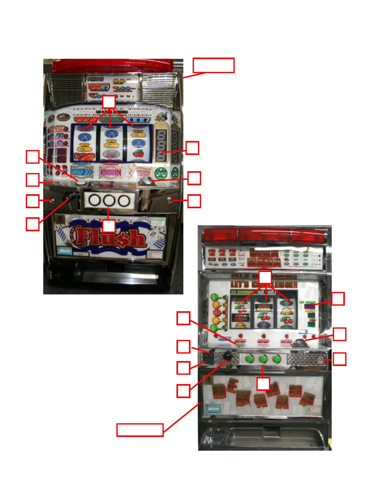 Bellco Pachislo - Outside Description; Spin knob; Cash-out; Cancel button; 1 or 2 Bet button