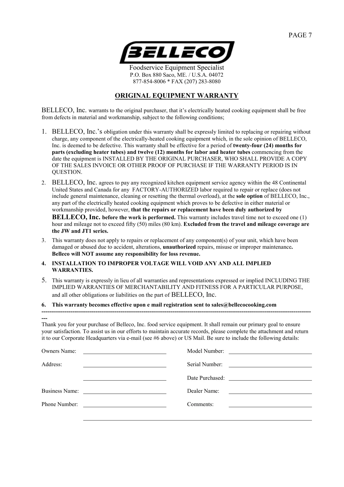 Thank you for your purchase of Belleco, Inc. food service equipment. It shall remain our primary goal to ensure