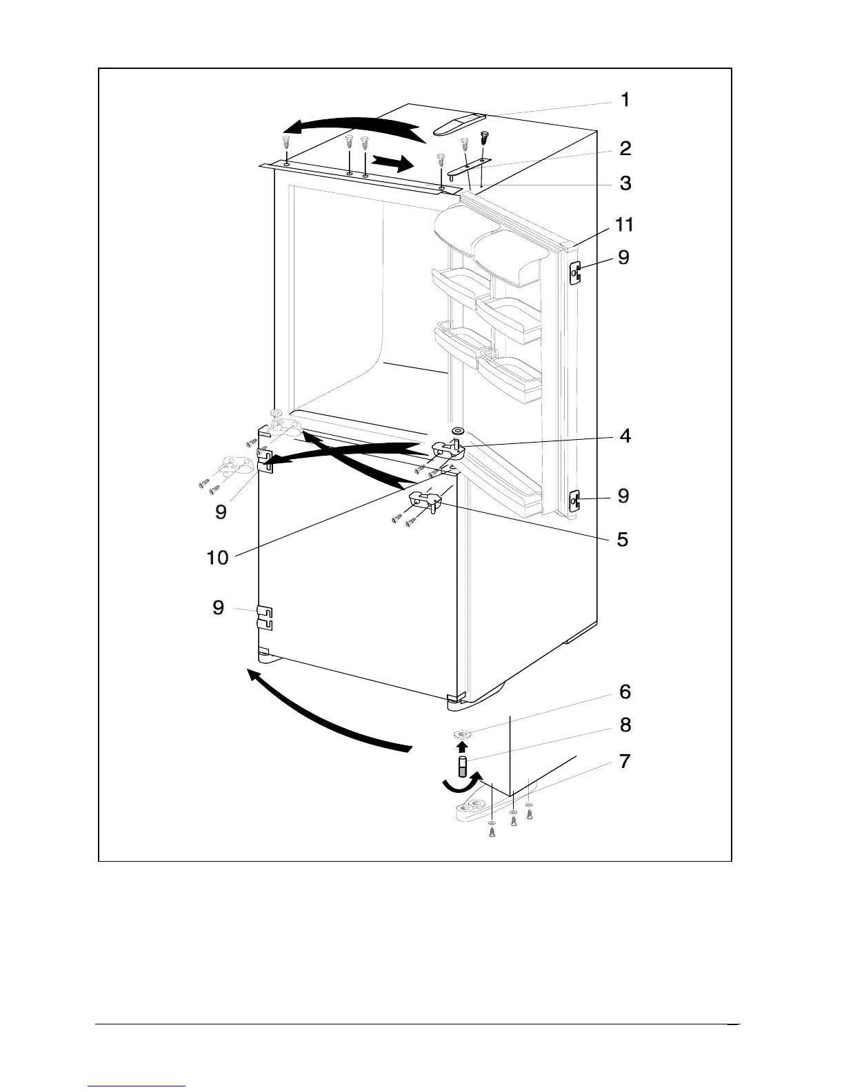 2 Top hinge of the refrigerator door 8 Bottom hinge pivot of the freezer