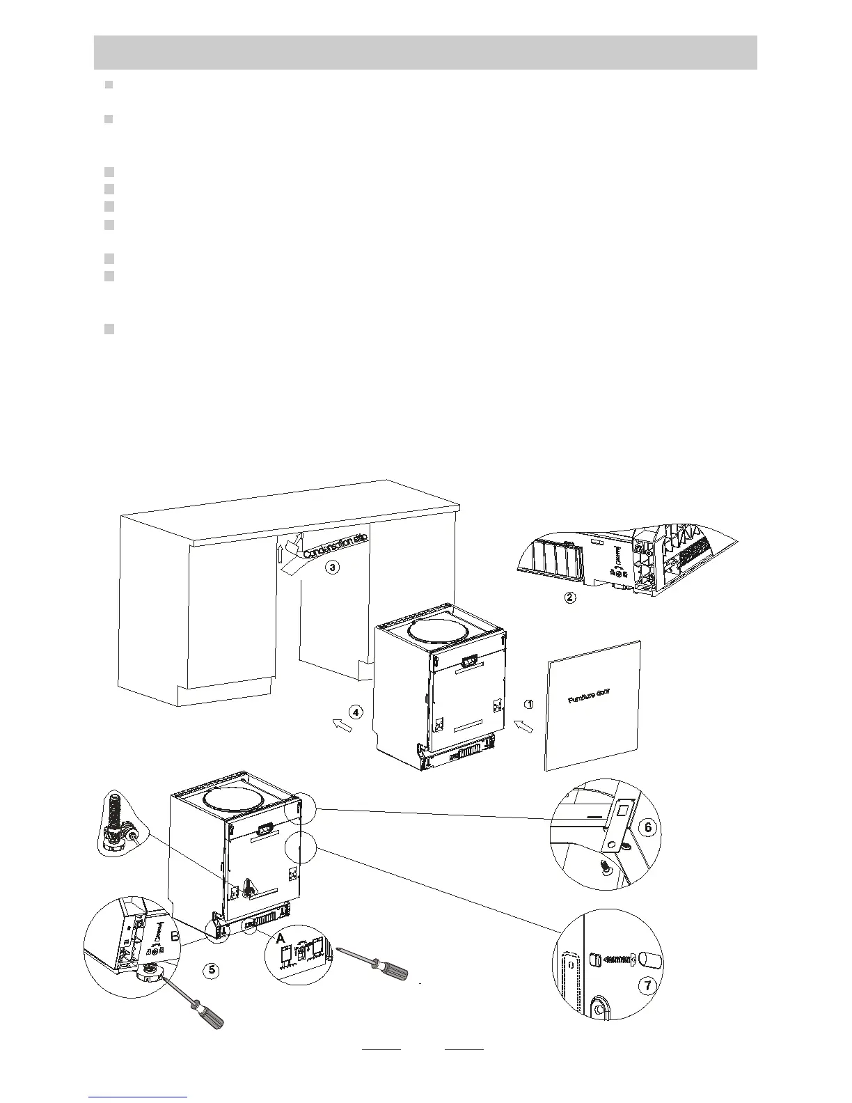 the front feet, use a flat screw driver and turn the fron t feet un til the dishw asher is level (Illustration 5B).
