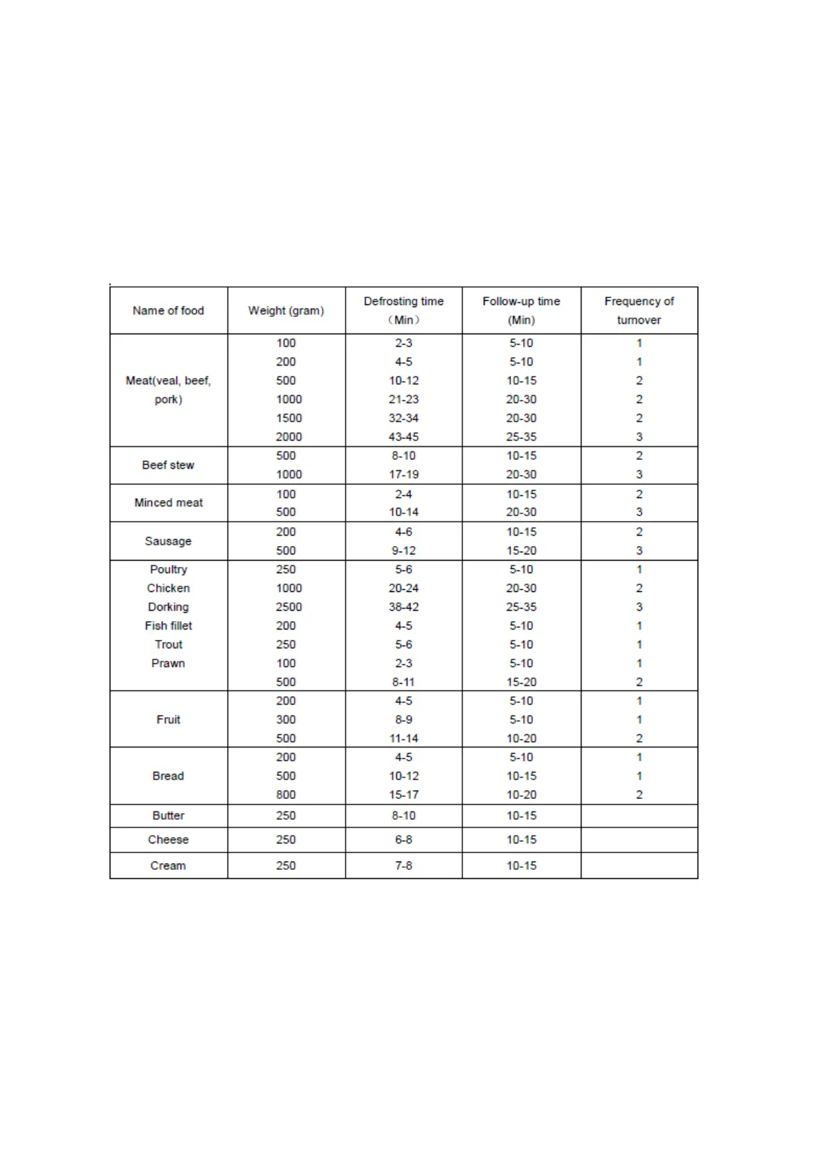 • Do not forget that by using the defrosting function you need to allow for standing time until the food is completely