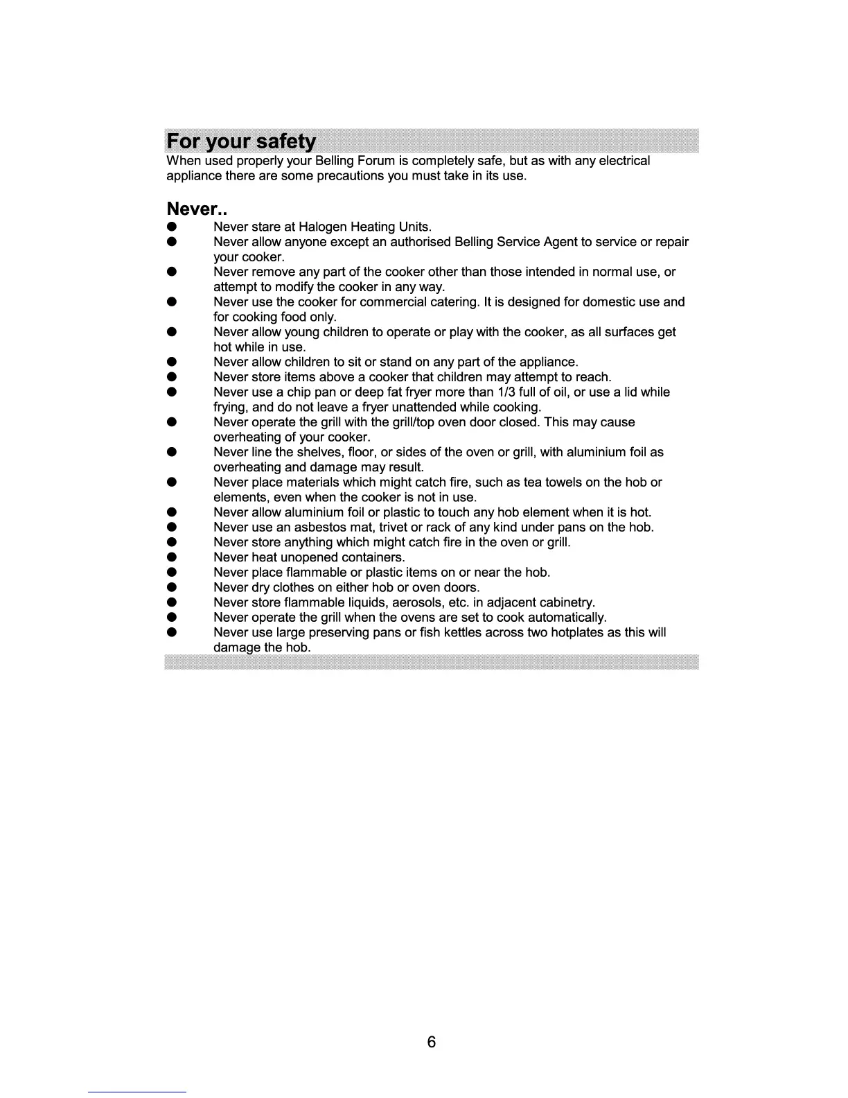 Belling Forum 351 - For Your Safety; Prohibited Actions (Never)