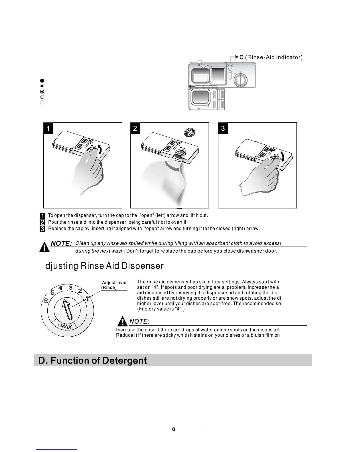 The ri nse aid dispe nser has si x or four setti ngs. Al ways star t wi th the di spens er
