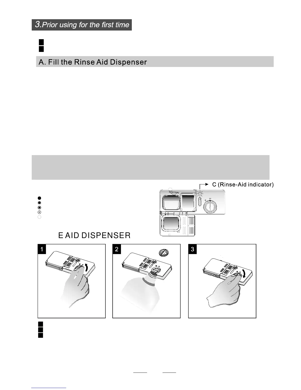 indicator "C" located next to the cap. When therinse-aid container is full, thewhole indicator will be dark .As the