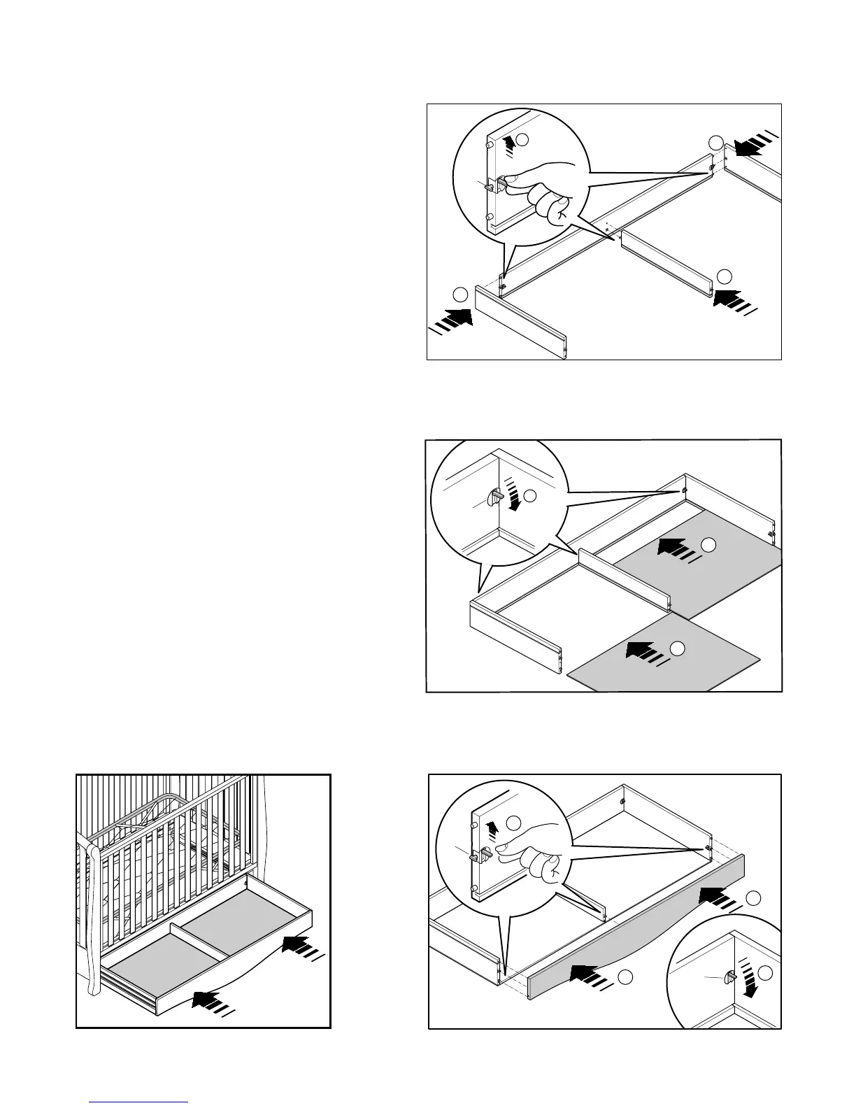 Slide drawer into guides on crib end panels.
