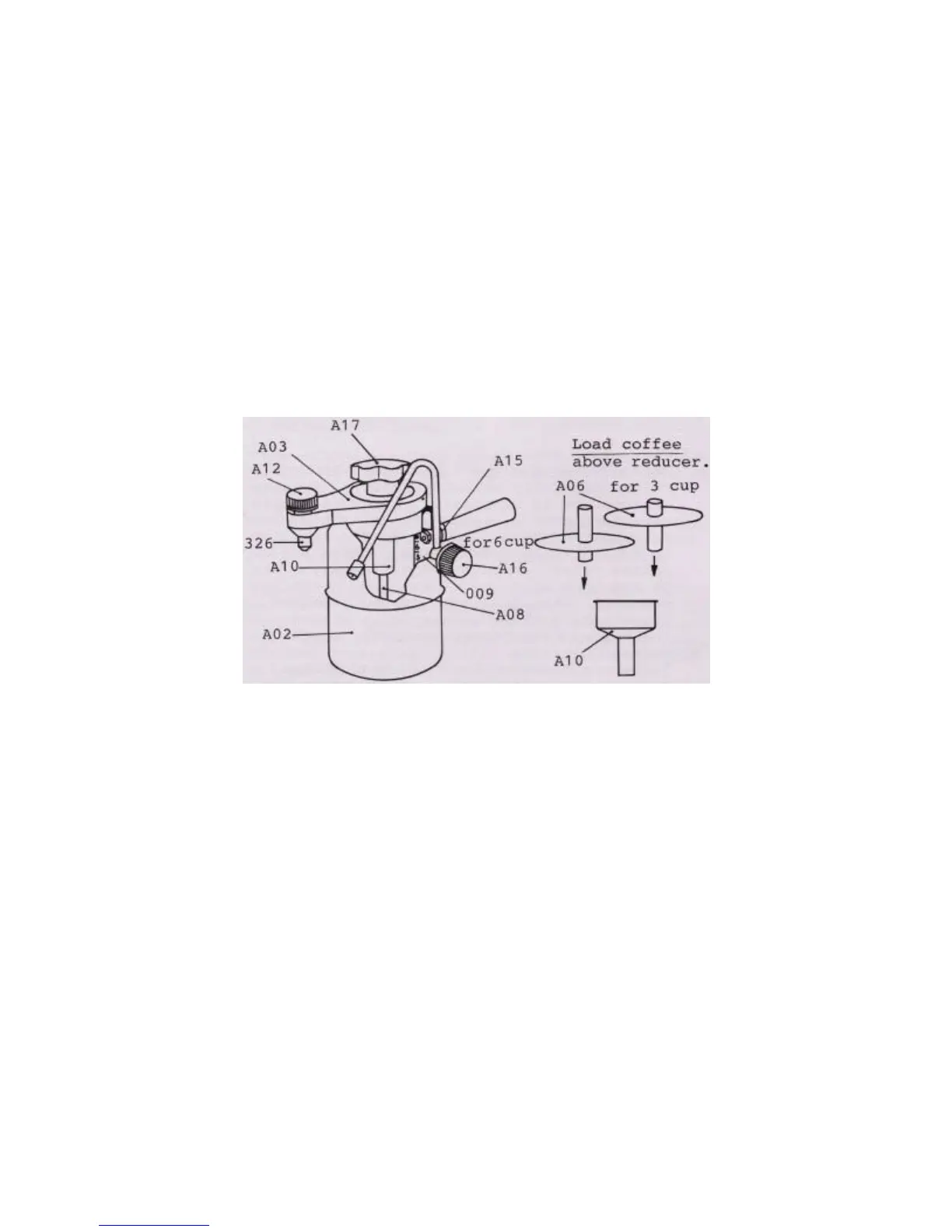 9) Put the brew basket (A10) onto the main shaft (A08). Make sure the O-ring is resting against the underside of the