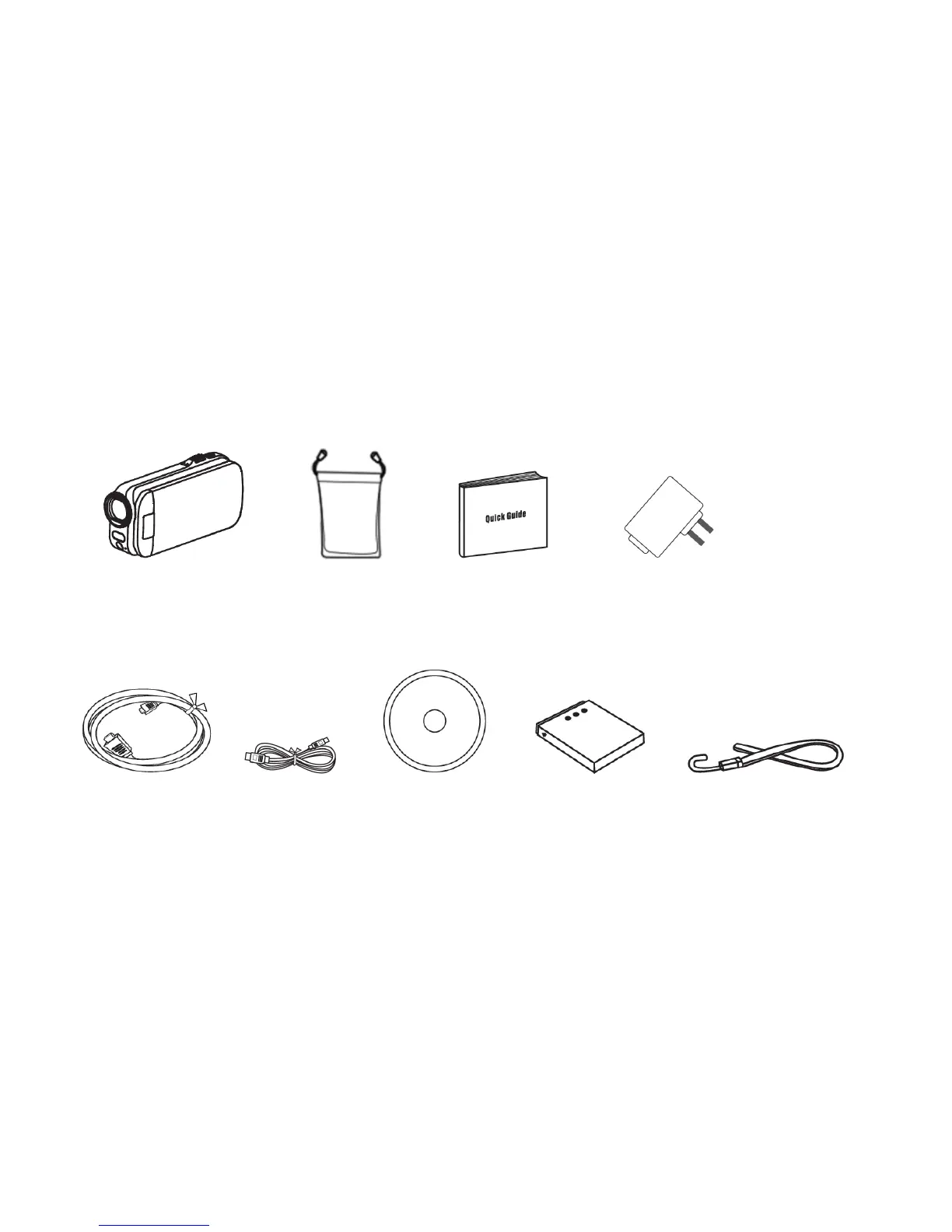 (1) Digital Video Camcorder (2) Pouch (3) Quick Guide (4) Charger