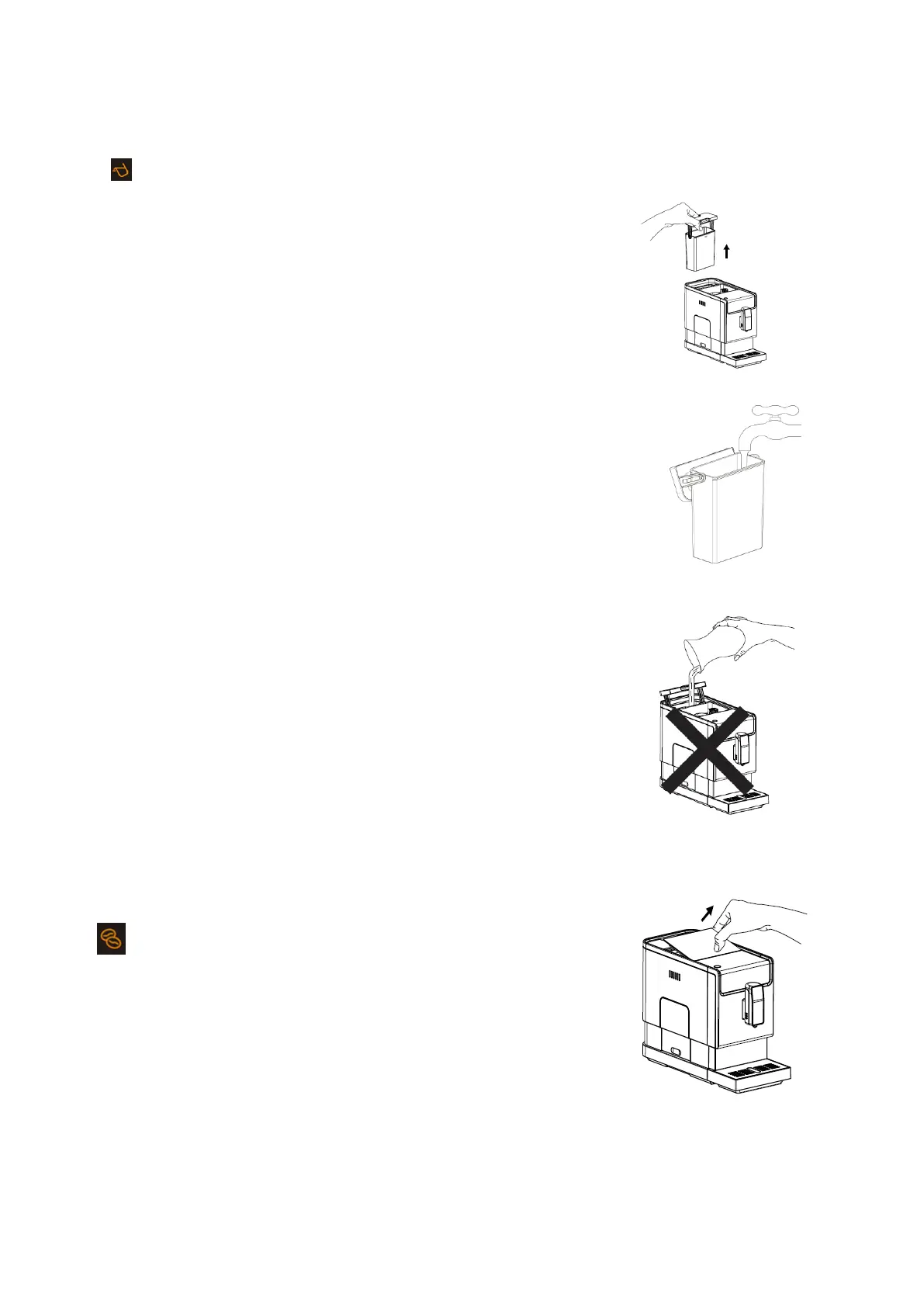 IMPORTANT: Never fill the water tank with warm, hot, sparkling water or any other liquid which might
