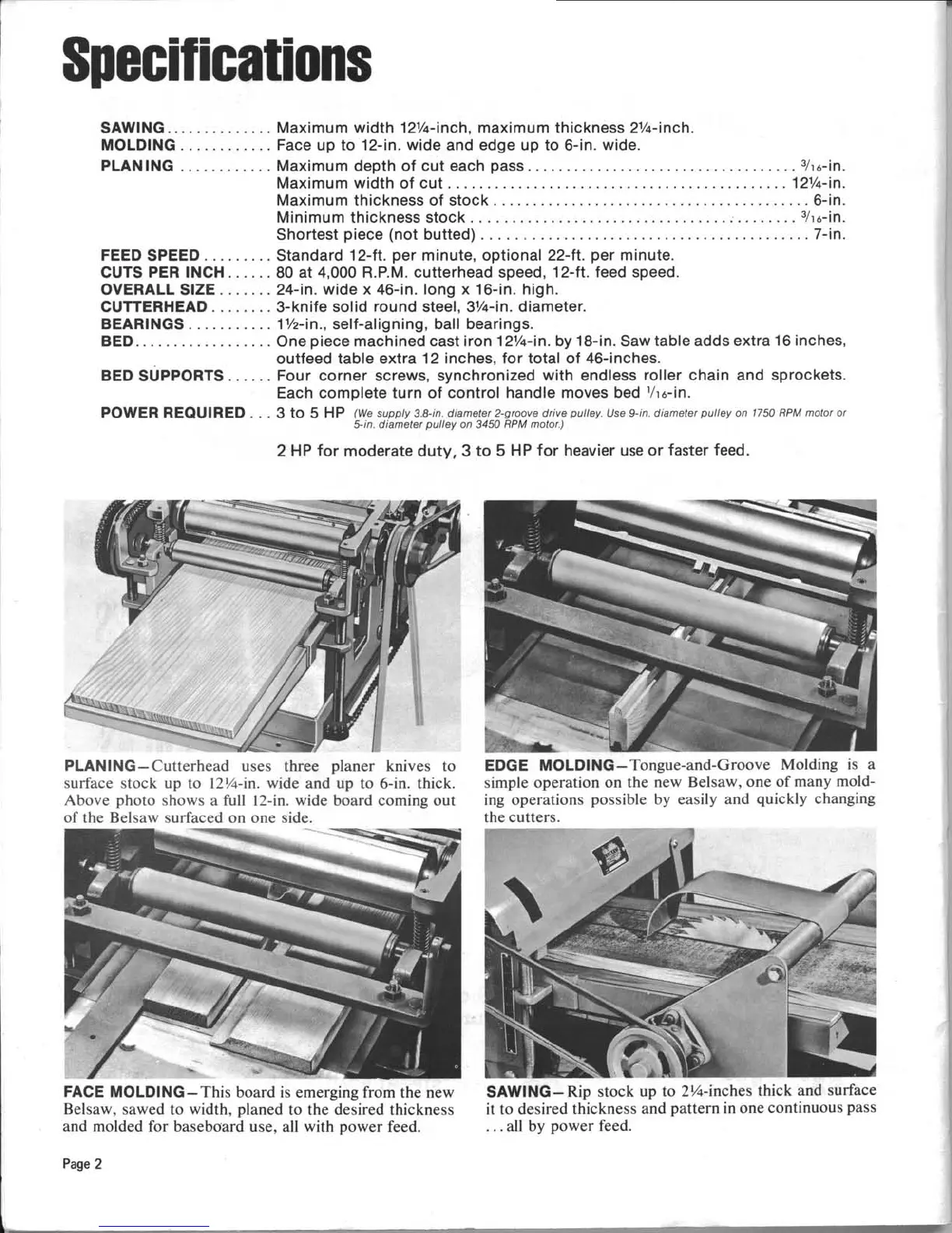 Belsaw 910 - Specifications; Sawing Specifications; Molding Specifications; Planing Specifications