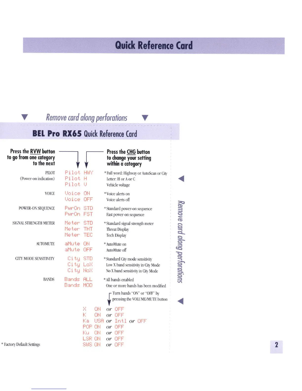 Beltronics RX 65 - Quick Reference Card Details; Programming Options Overview