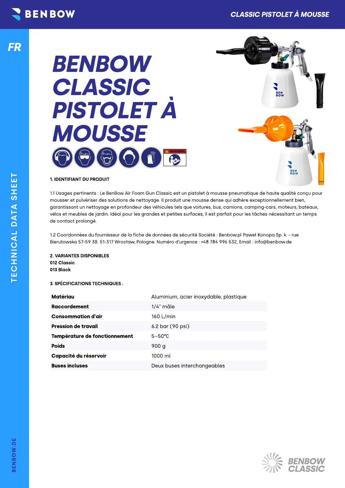 1.1 Usages pertinents : Le BenBow Air Foam Gun Classic est un pistolet à mousse pneumatique de haute qualité conçu pour