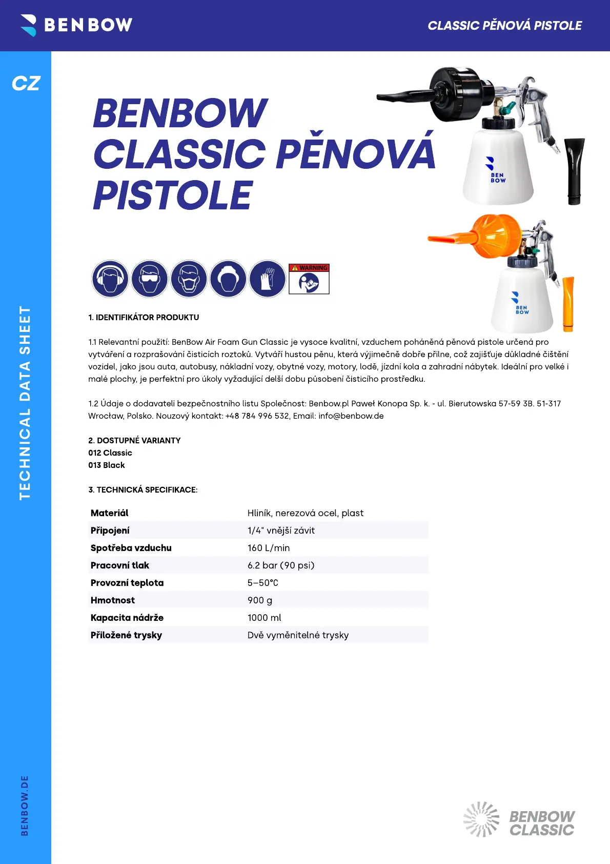 1.1 Relevantní použití: BenBow Air Foam Gun Classic je vysoce kvalitní, vzduchem poháněná pěnová pistole určená pro