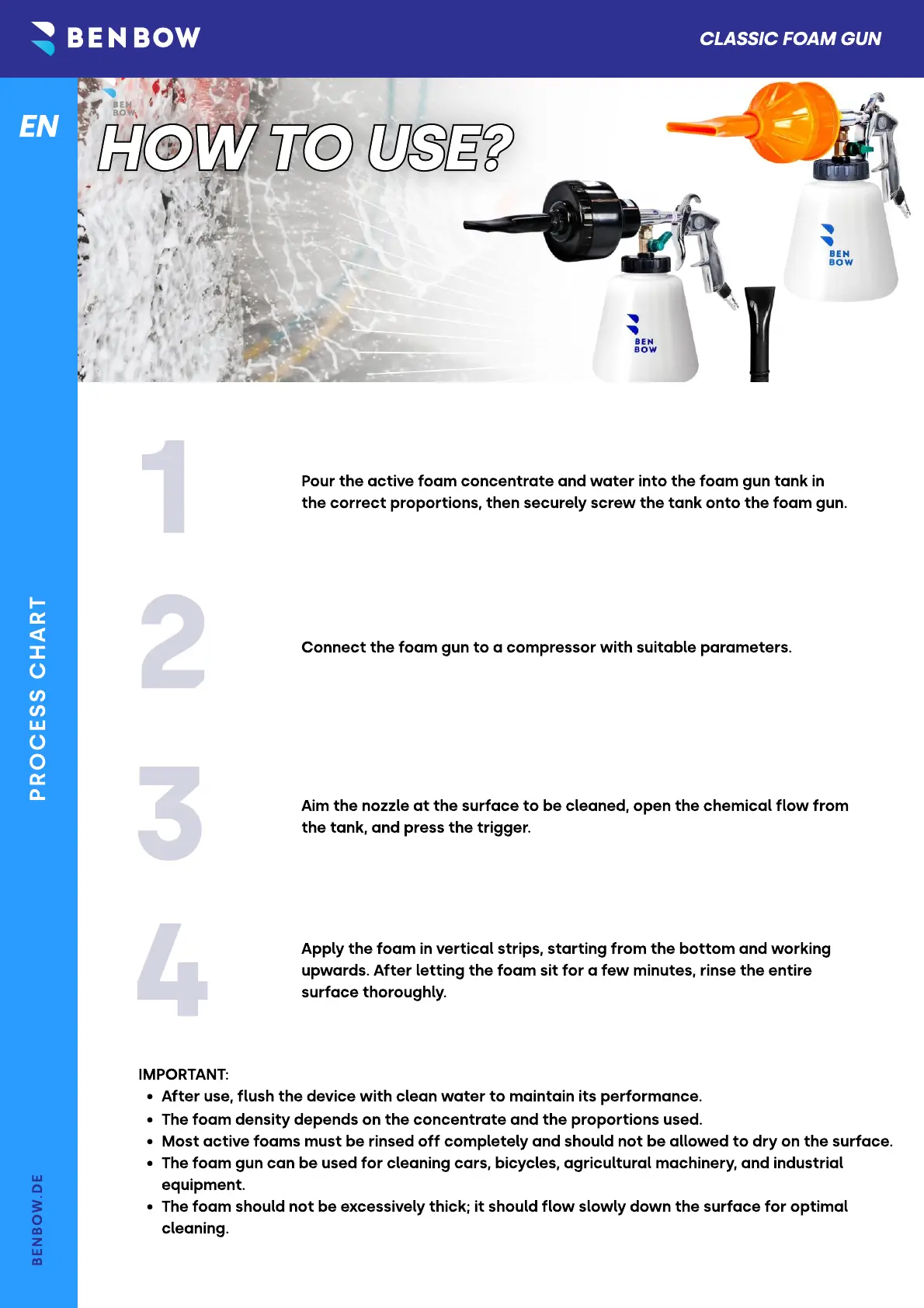 The foam gun can be used for cleaning cars, bicycles, agricultural machinery, and industrial
