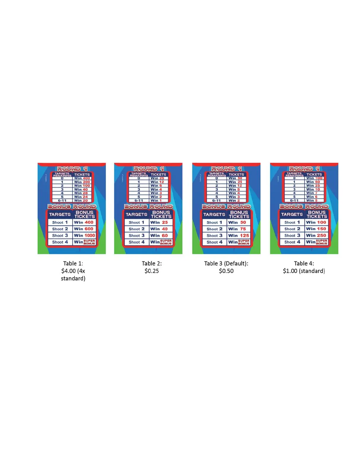 There are four payout tables to choose from. Here are the recommended tables per credit value: