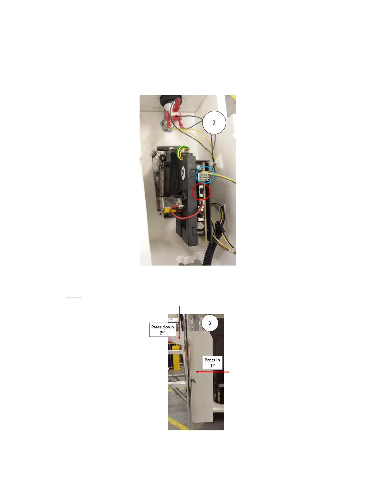 - Make sure the coin mech wires inside the button assembly shown in②. The wire connection