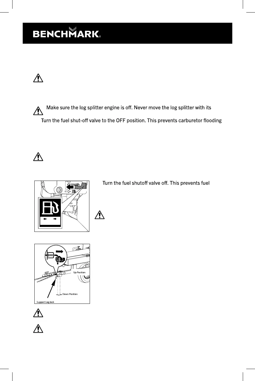 3. Lock the support leg in the DOWN position before you move the log splitter.