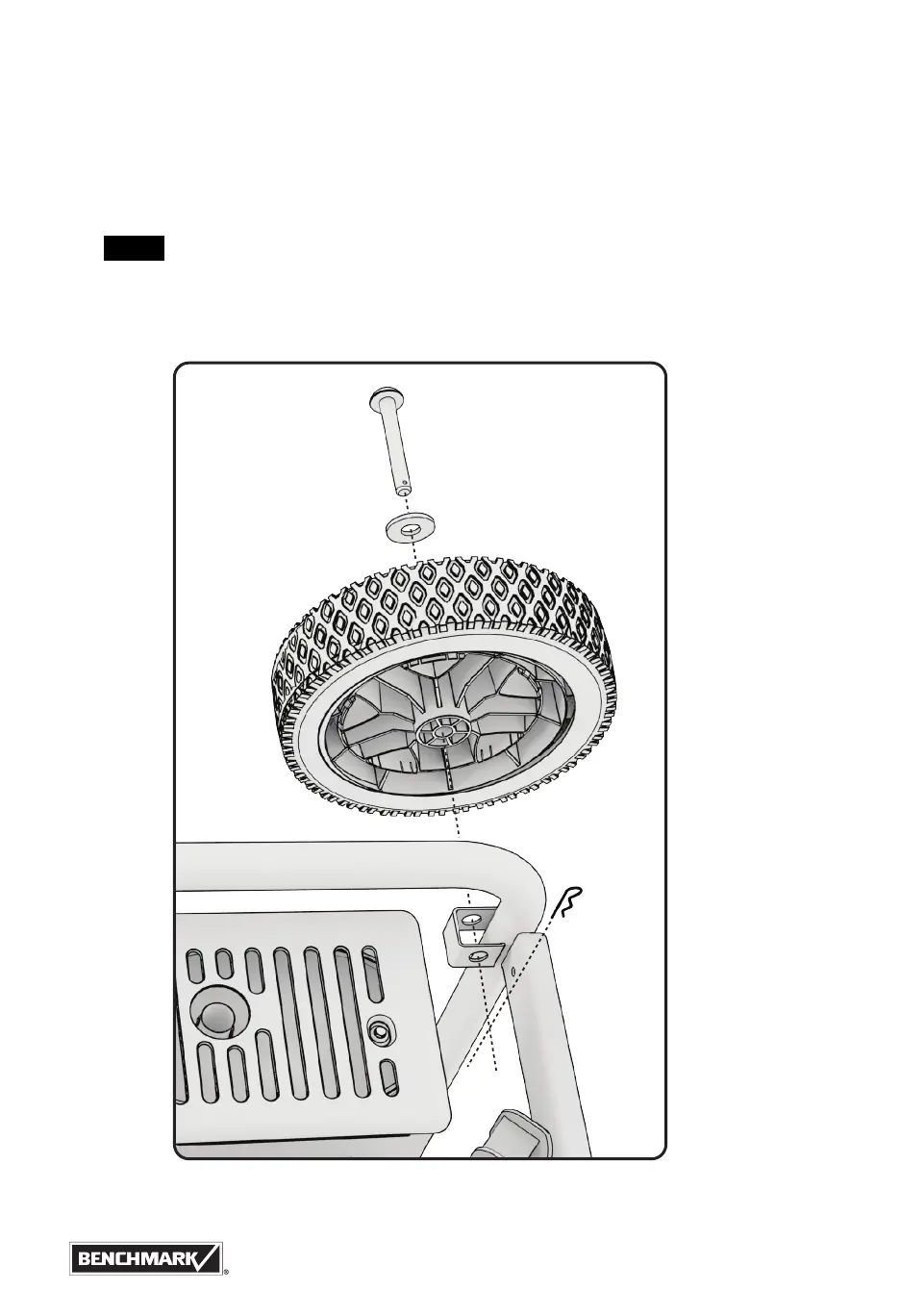 1. Install the wheels, foot, and handle as shown below.