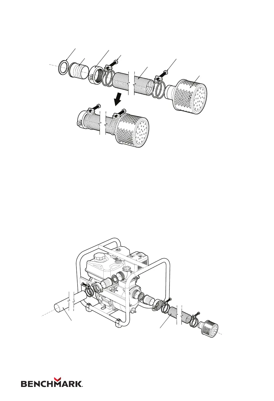 4. Insert strainer into the suction hose and tighten the hose clamp around the