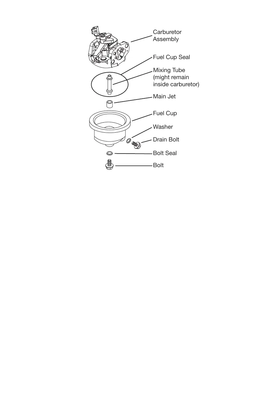 5. Remove the bolt, Bolt Seal, fuel cup, Fuel Cup Seal and Main Jet from the