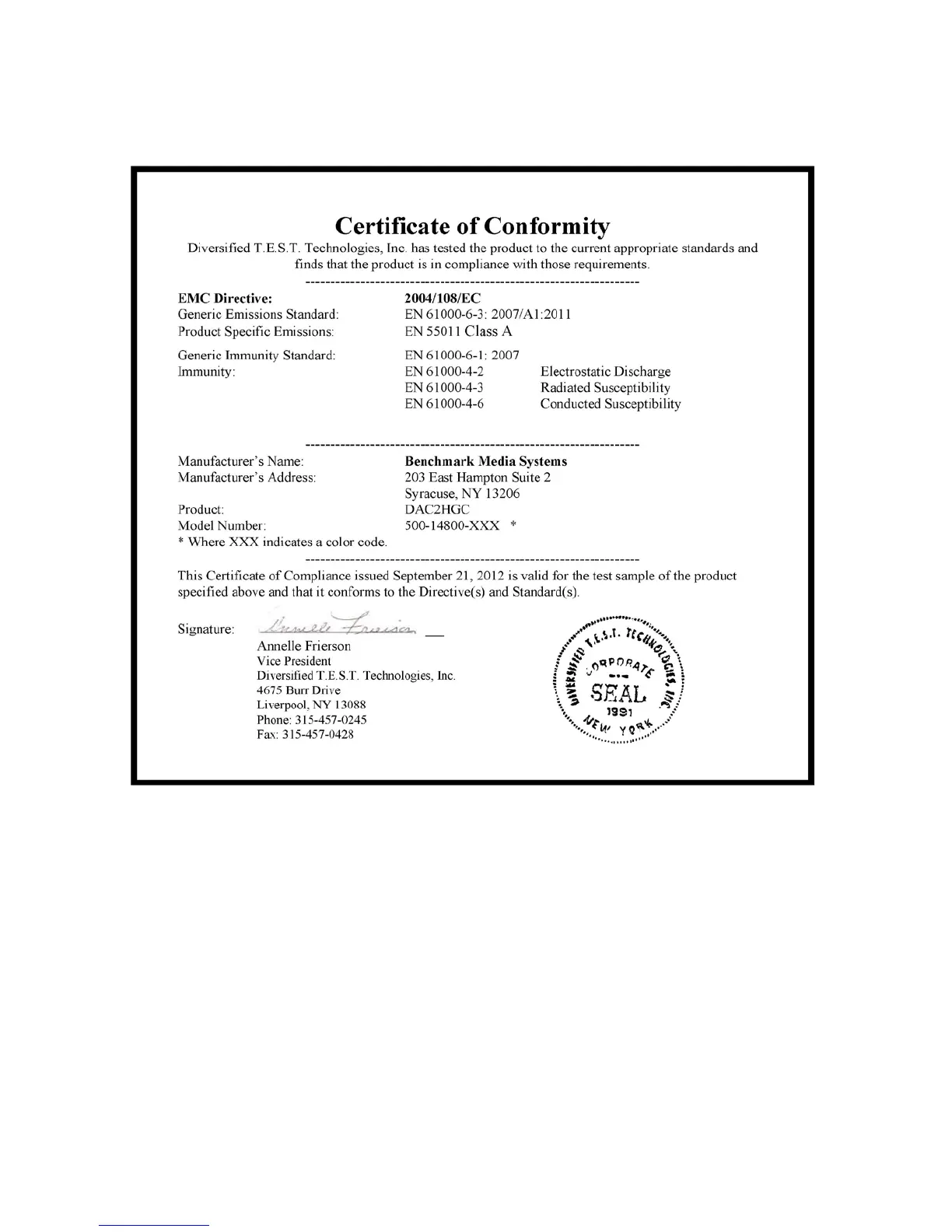 Benchmark DAC3 HGC - CE Certificate of Conformity