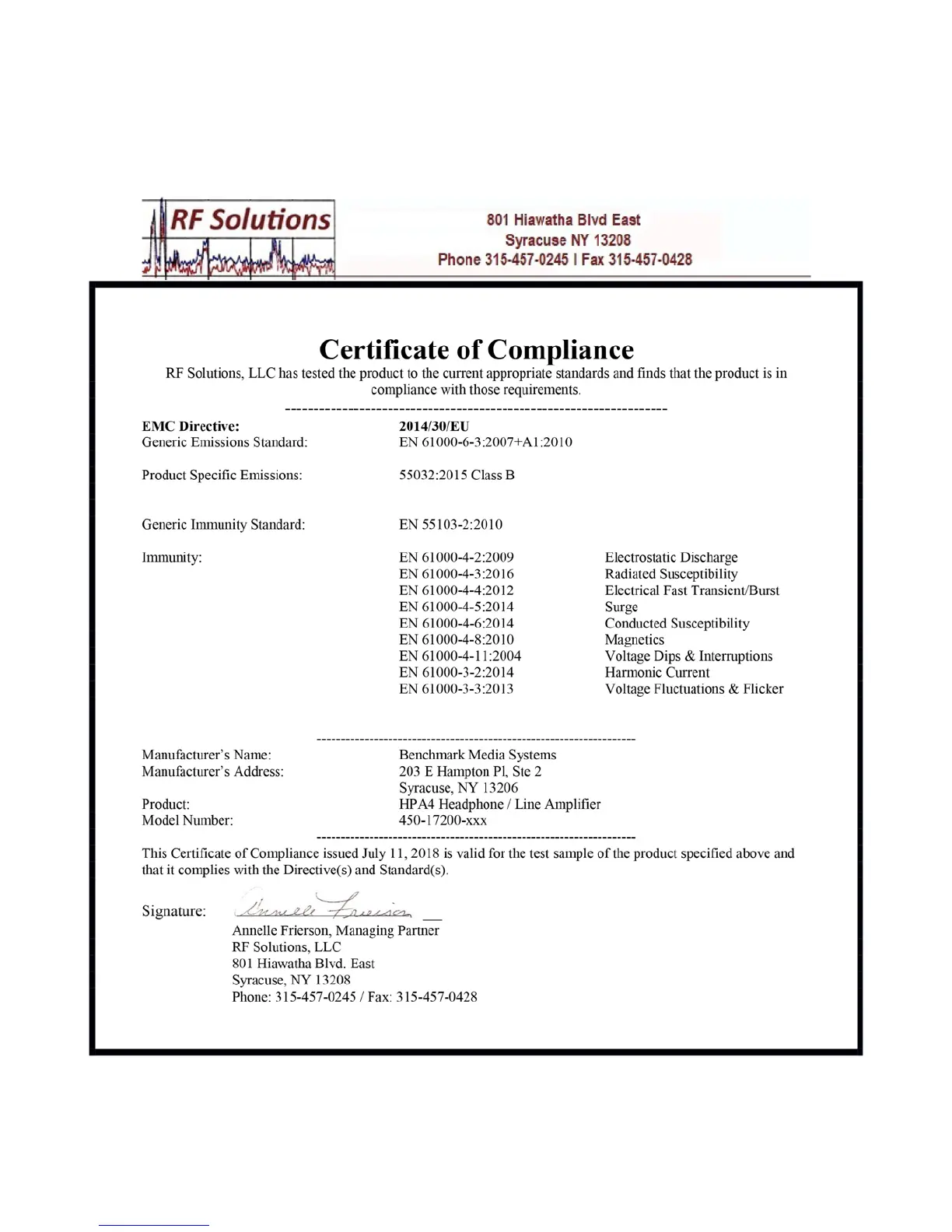 Benchmark HPA4 - CE Certificate of Compliance