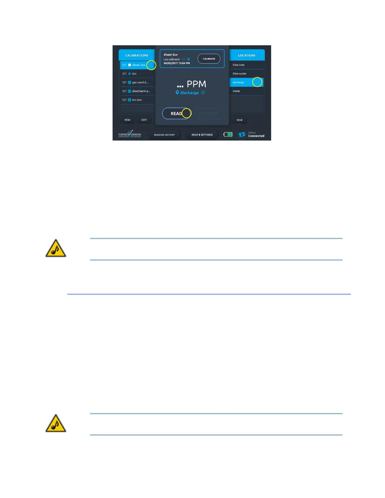 10. On the Home screen select a saved calibration in the Calibrations list (1).