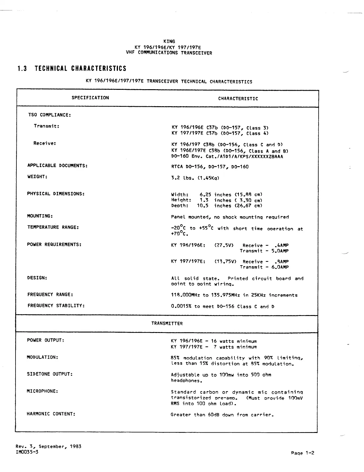KY 196/196E/197/197E TRANSCEIVER TECHNICAL CHARACTERISTICS