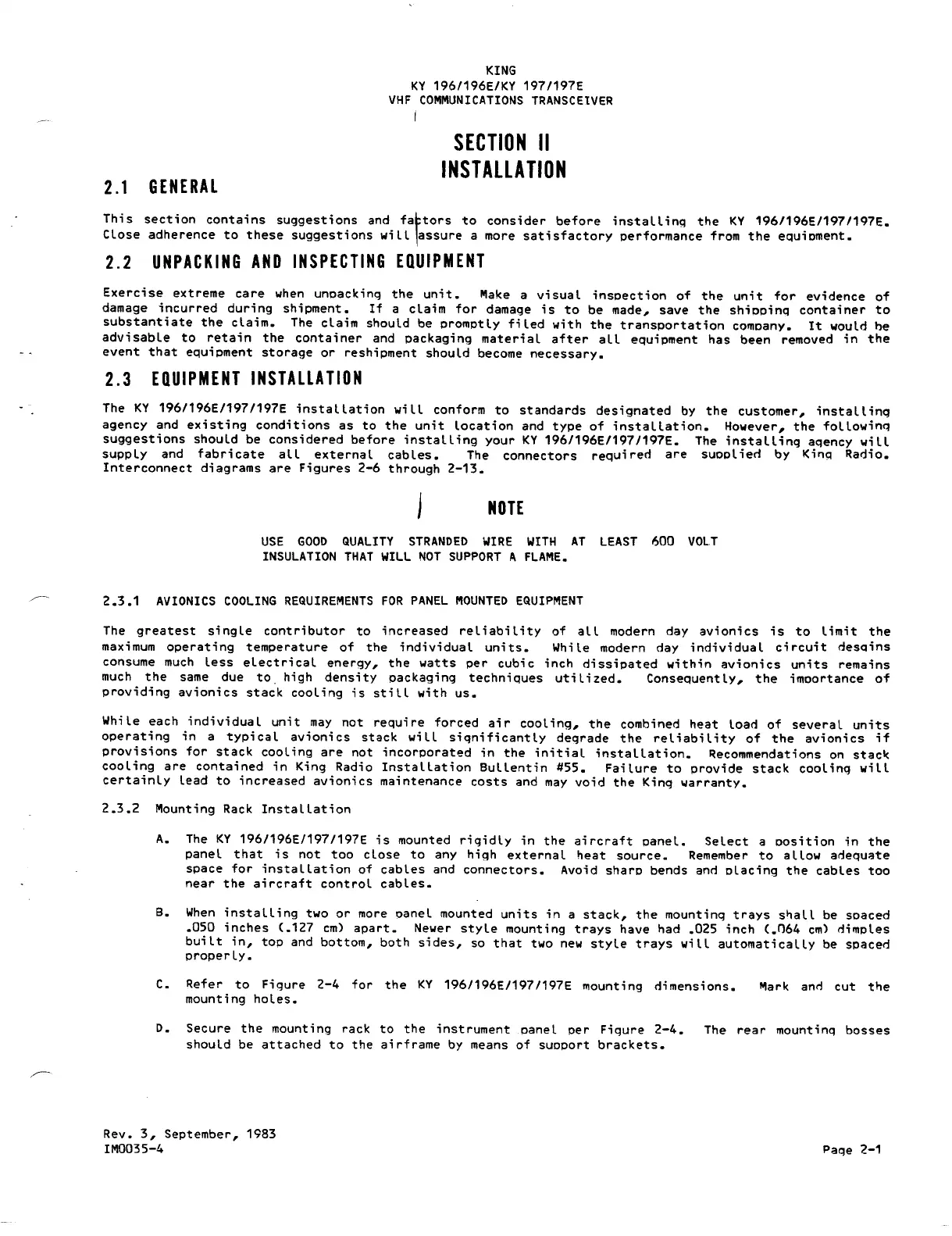 Bendix/King KY 196 - SECTION II INSTALLATION; 2.1 General; 2.2 Unpacking and Inspecting Equipment; 2.3 Equipment Installation