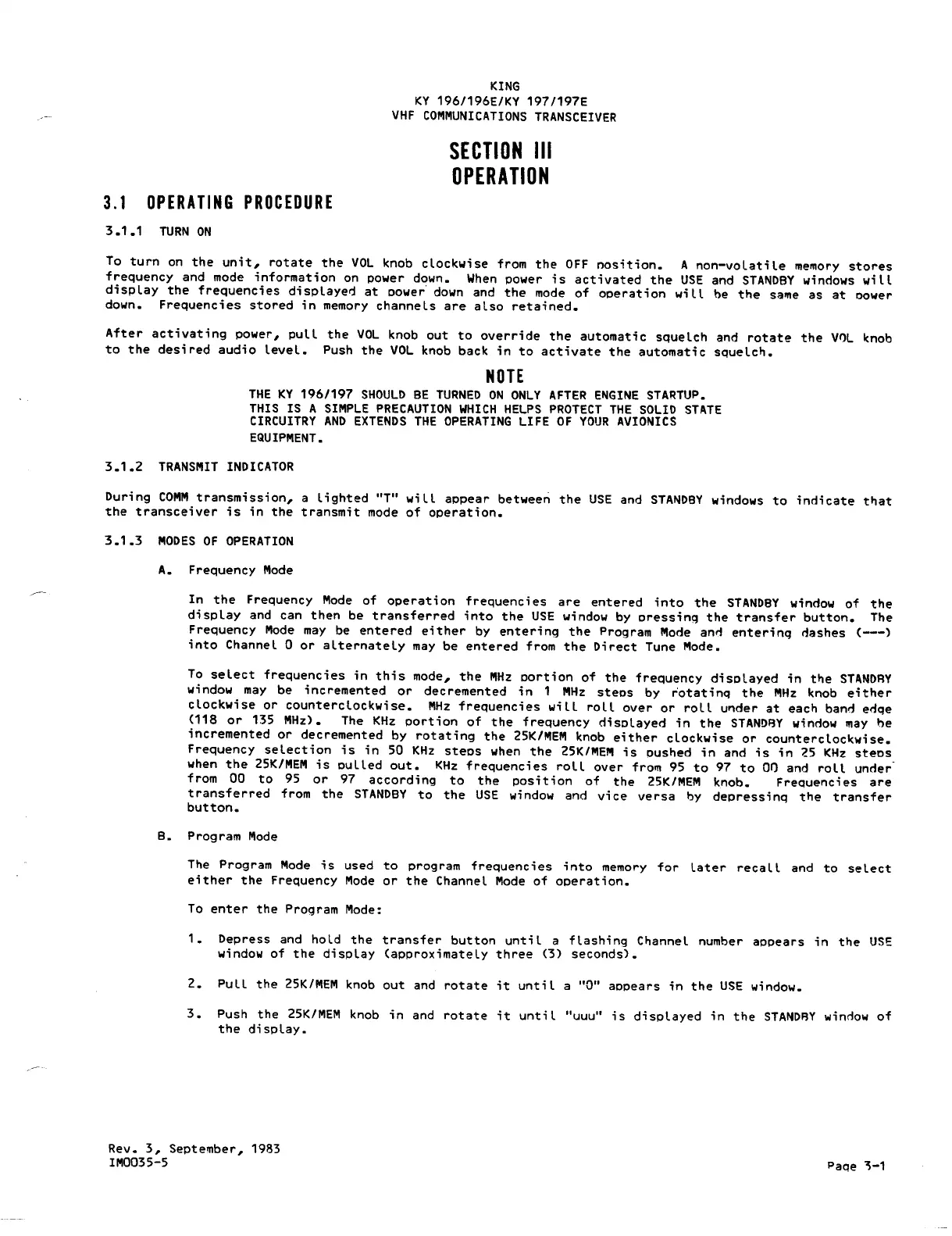 Bendix/King KY 197 - SECTION III OPERATION; 3.1 OPERATING PROCEDURE; 3.1.1 TURN ON; 3.1.2 TRANSMIT INDICATOR