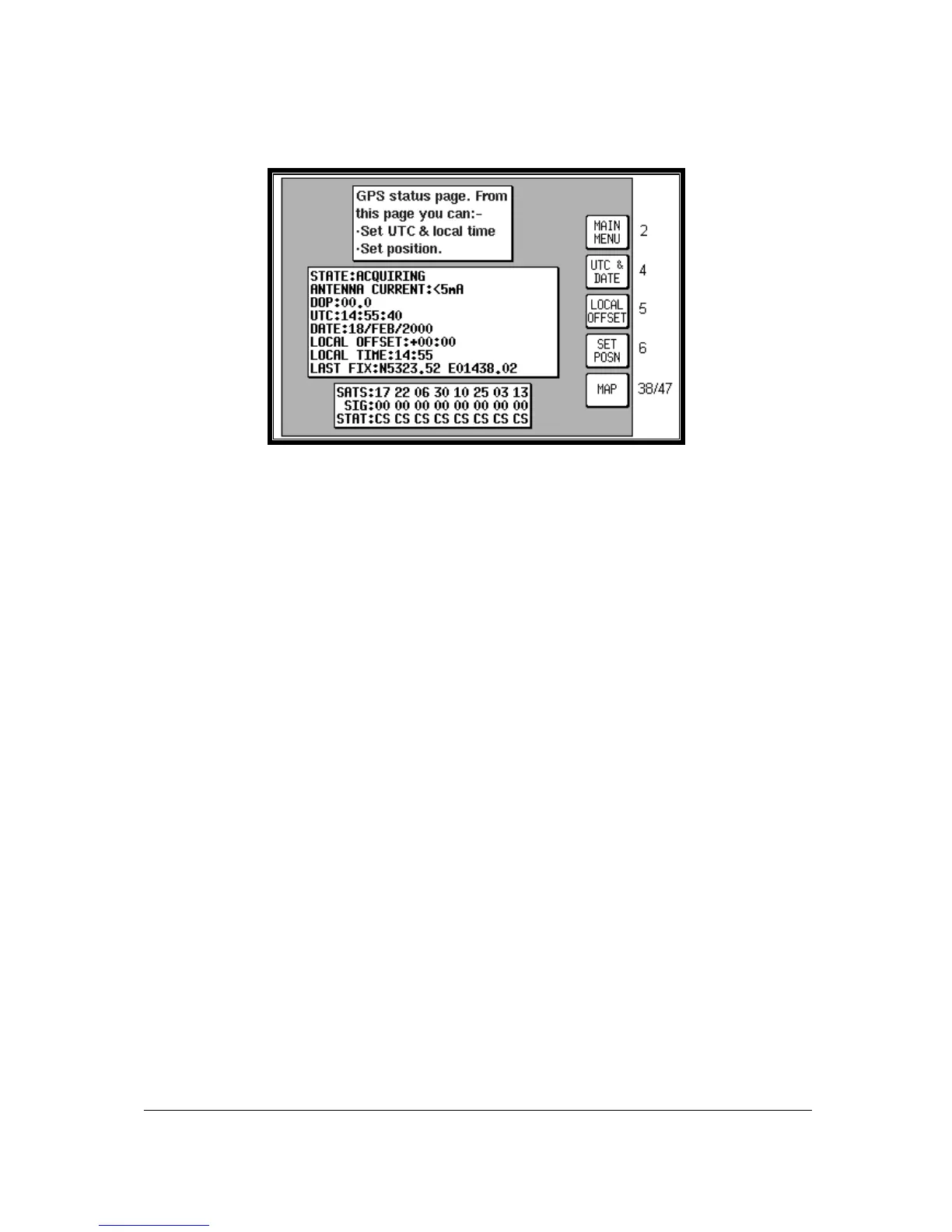 Pressing Key 1, GPS STATUS, in Main Menu, accesses this Screen.