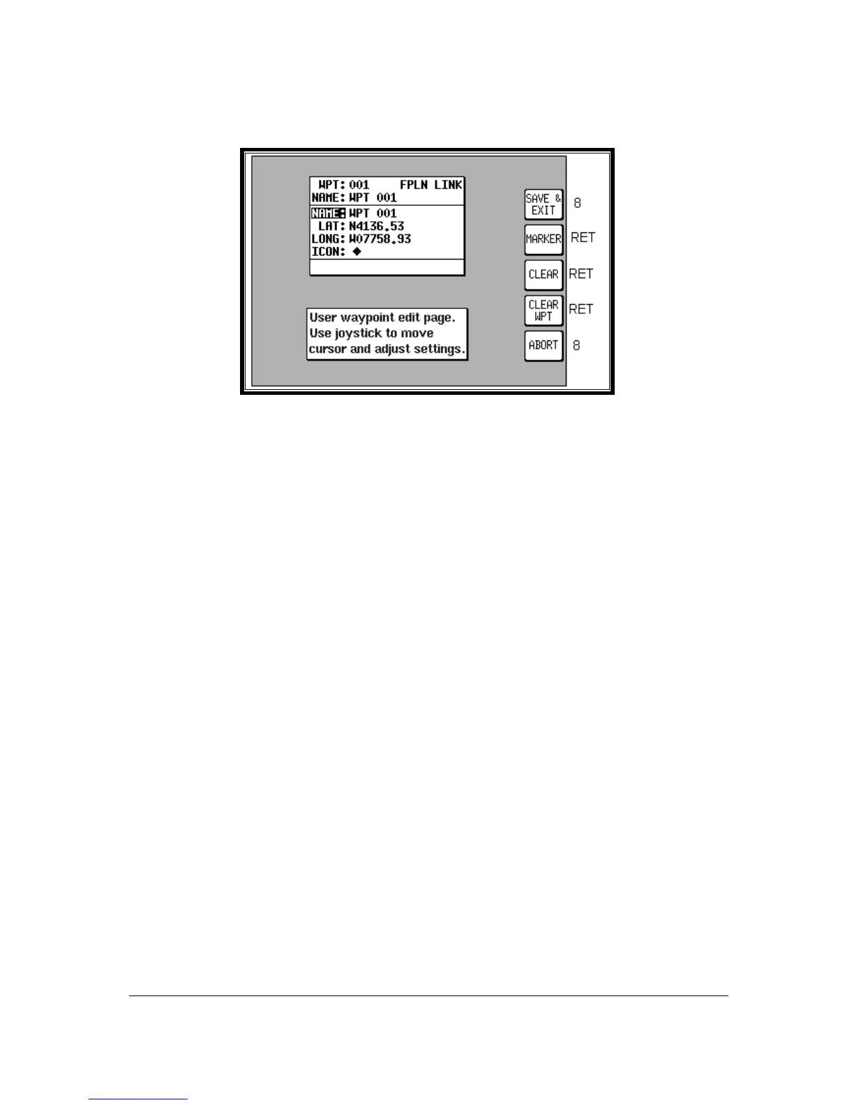 the cursor to the right so that the user waypoint name, latitude, longitude and icon type can be entered