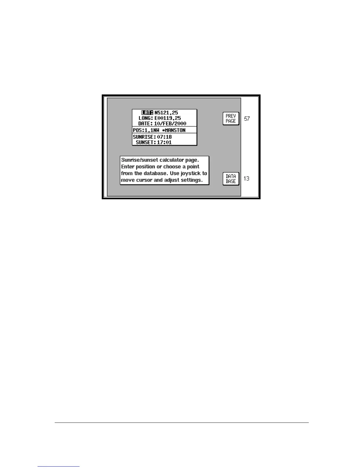 This feature is entered by pressing Key 5, SUNSET/RISE, on Screen 57, E6-B Calculator Cover Screen,