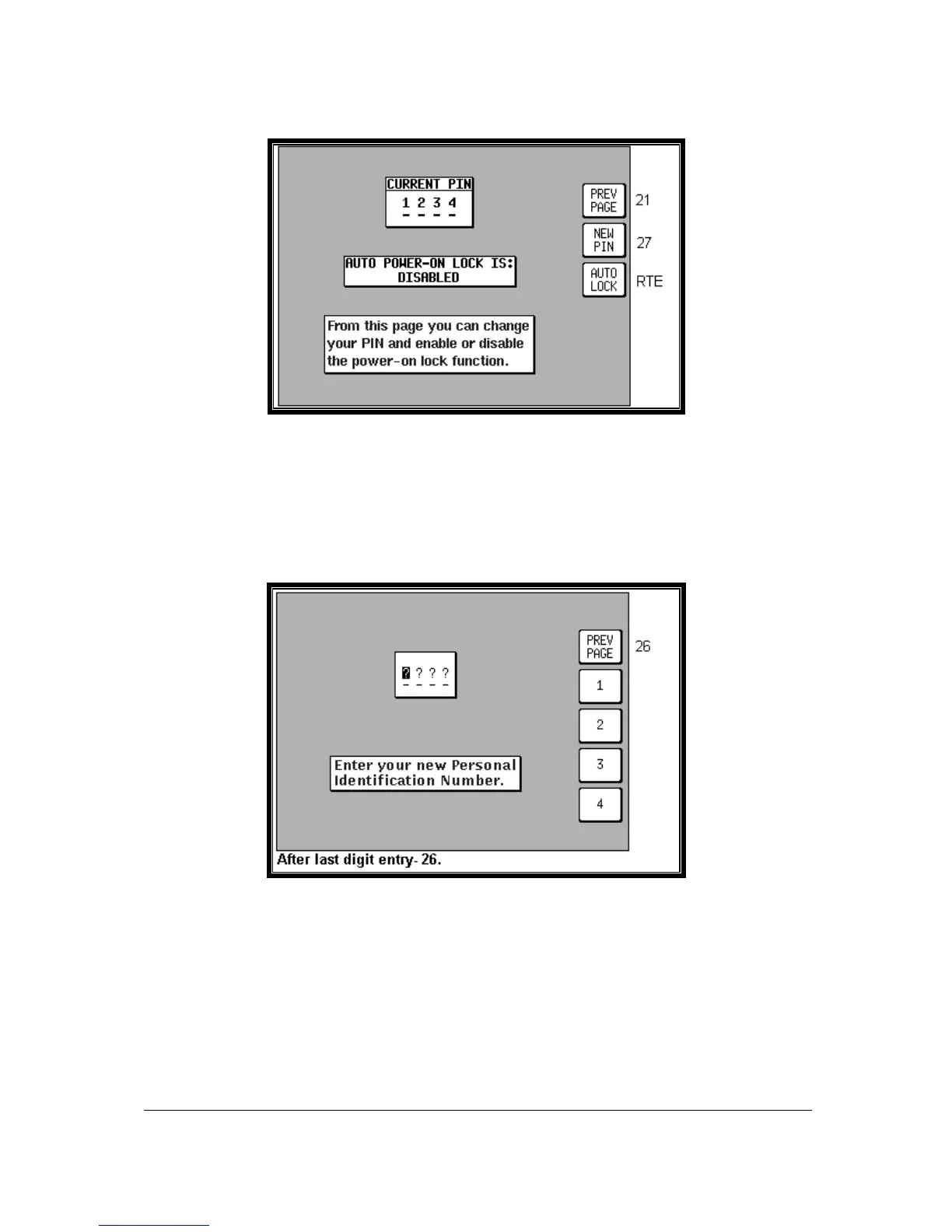 On entry to this Screen, the current PIN is displayed and the status of the AUTO POWER-ON LOCK is