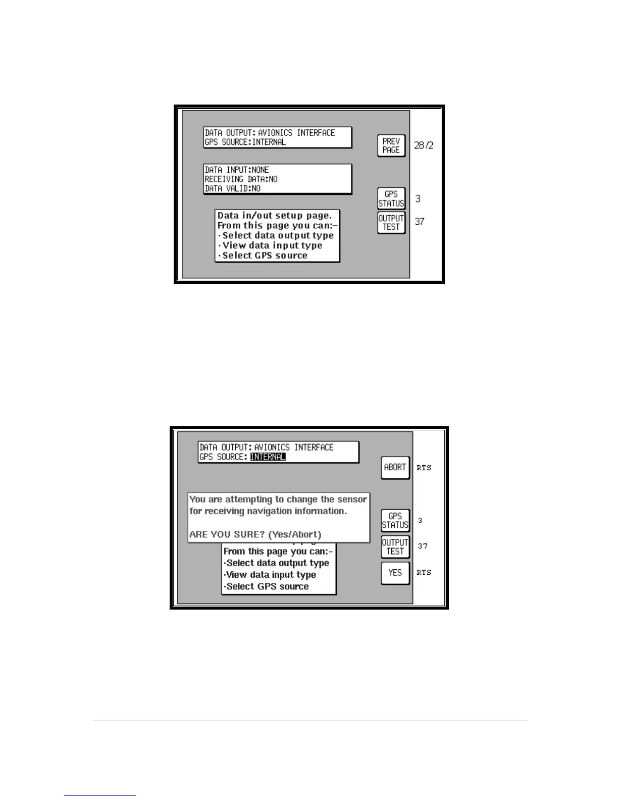 On entry to this Screen details of the current settings for data output and GPS Source are displayed in