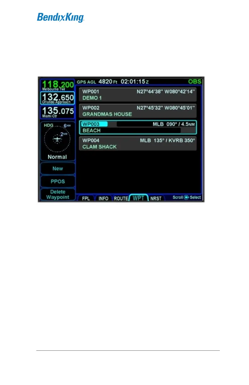 The WPT tab will list all user waypoints in the AeroNav. Up to